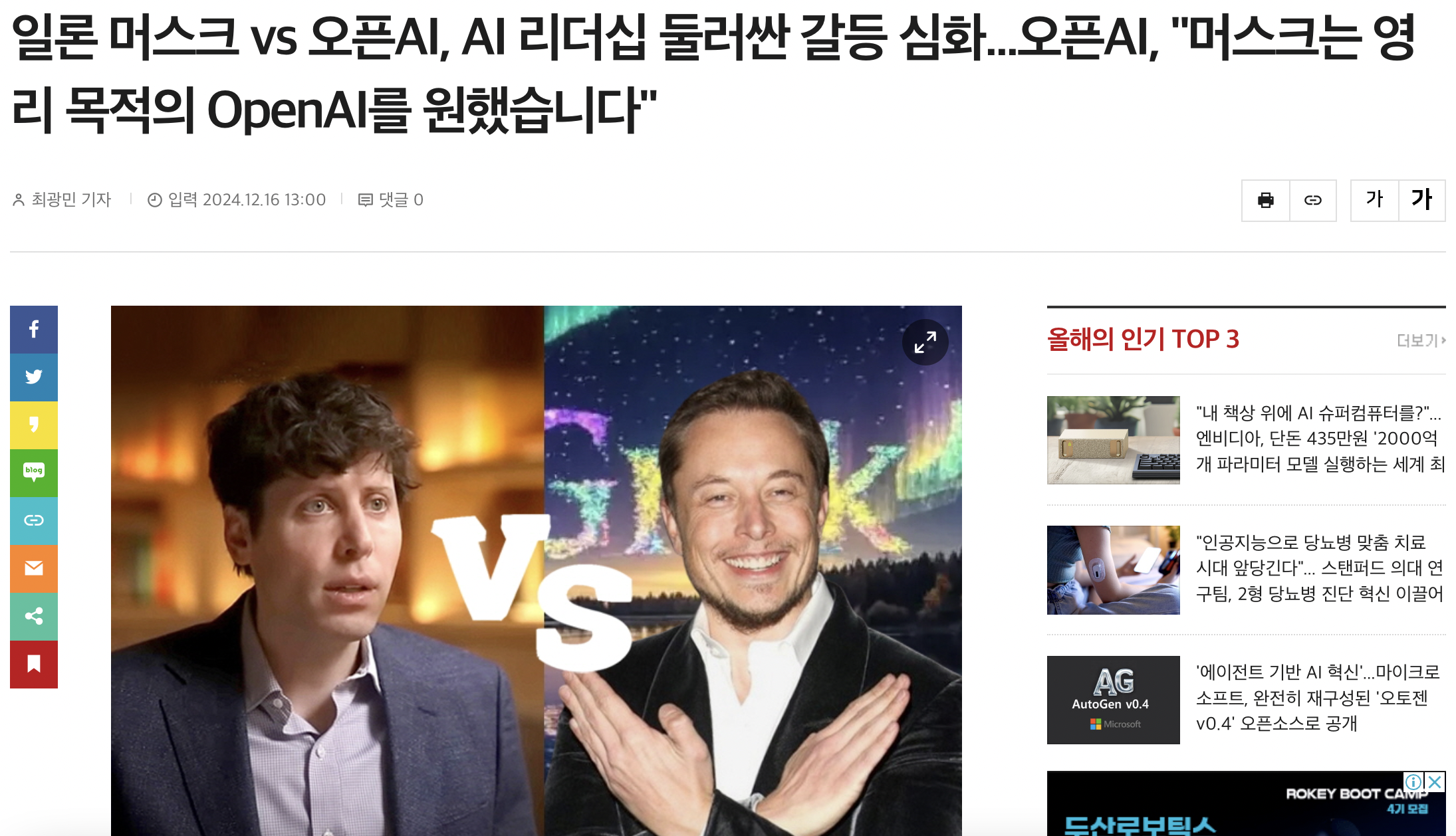 2024년 8월 일론 머스크는 “ 마이크로소프트로부터 130억 달러(약 17조 원) 투자를 받고 AI 기술을 제공하는 과정에서 초기 설립 계약을 위반했다”라고 주장하며 OpenAI상대로 소송을 진행하고 있습니다.