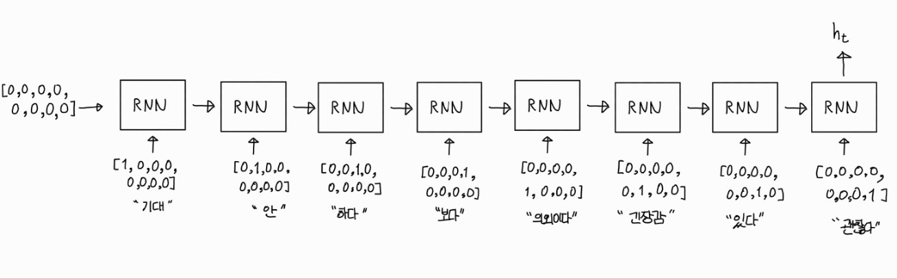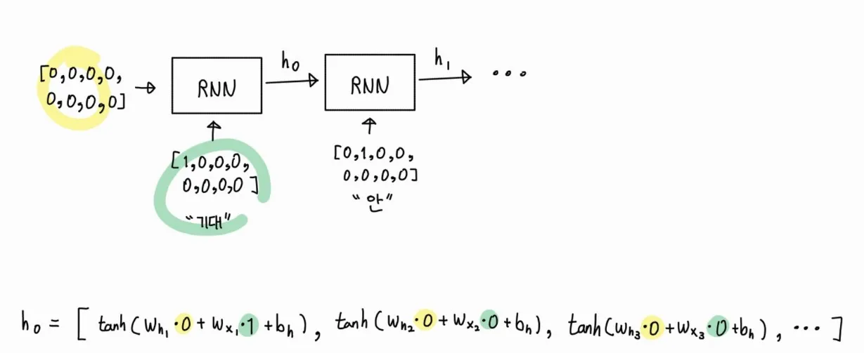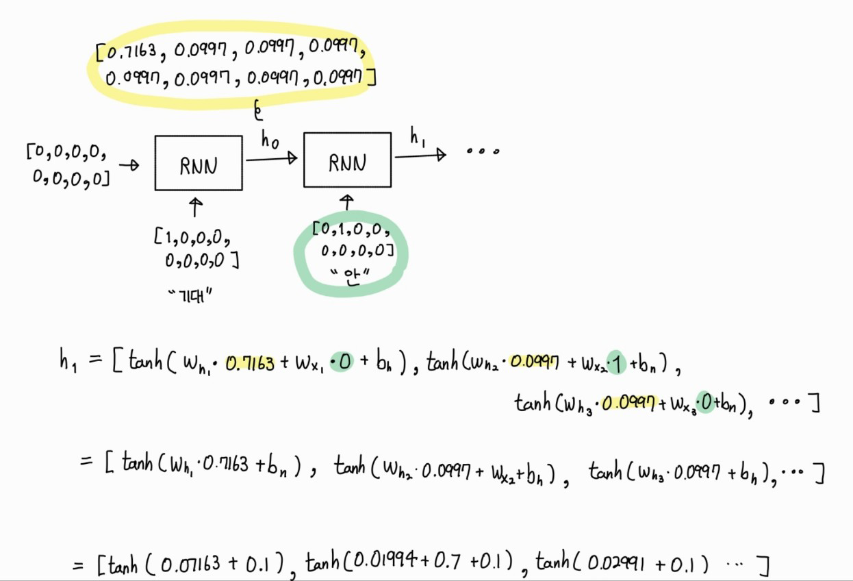 단지 ht-1 값이 [0, 0, 0, 0, 0, 0, 0, 0] 이 아니라 “기대”토큰과 [0, 0, 0, 0, 0, 0, 0, 0]이 RNN의 입력으로 들어가 결과로 반환 받은 [0.7163, 0.0997, 0.0997, 0.0997, 0.0997, 0.0997, 0.0997, 0.0997] 입니다.