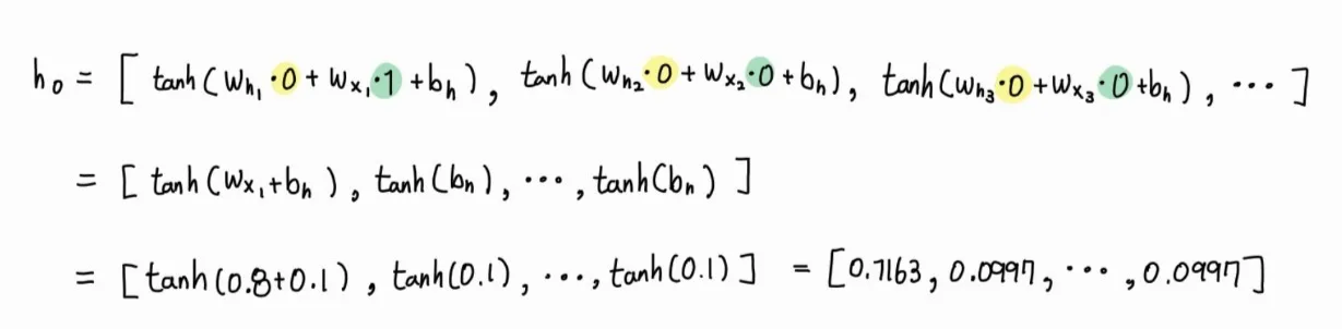 RNN이 출력하는 ht의 값 중 첫 번째 값인 h0에 대한 계산 방법 입니다.