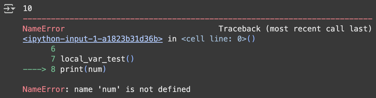 함수 안에서 print(num)의 실행 결과인 10은 잘 출력이 되었는데 함수 밖에서 명령한 print(num)에서 에러가 발생한 모습입니다.